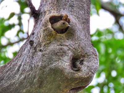 Minutes after the Spotted Towhee, I played peekaboo with this tiny House Wren. It has a solid nesting spot in a hole in this tree.