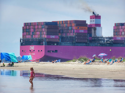 It continues to interest me- this casual and passive interaction between the mighty ships at sea and folks on the beach doing their thing whether swimming, sunning, reading, fishing or playing games.