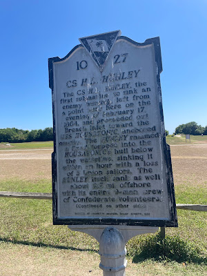 This part of the island is full of history. As this sign explains near here on Feb. 17, 1864, the Confederate submarine Hunley was launched. That evening it stuck an explosive into the Union ship Housatonic. This was the first use of a submarine to sink a ship in battle.